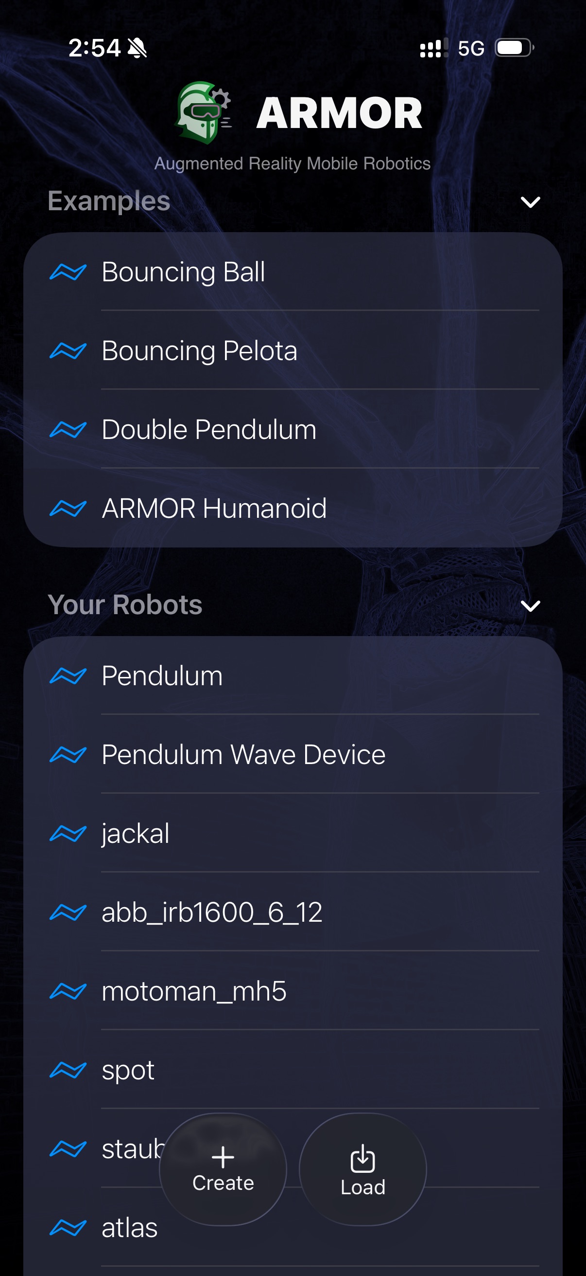 ARMOR sidebar menu displaying imported URDF robot models and user projects on iPhone