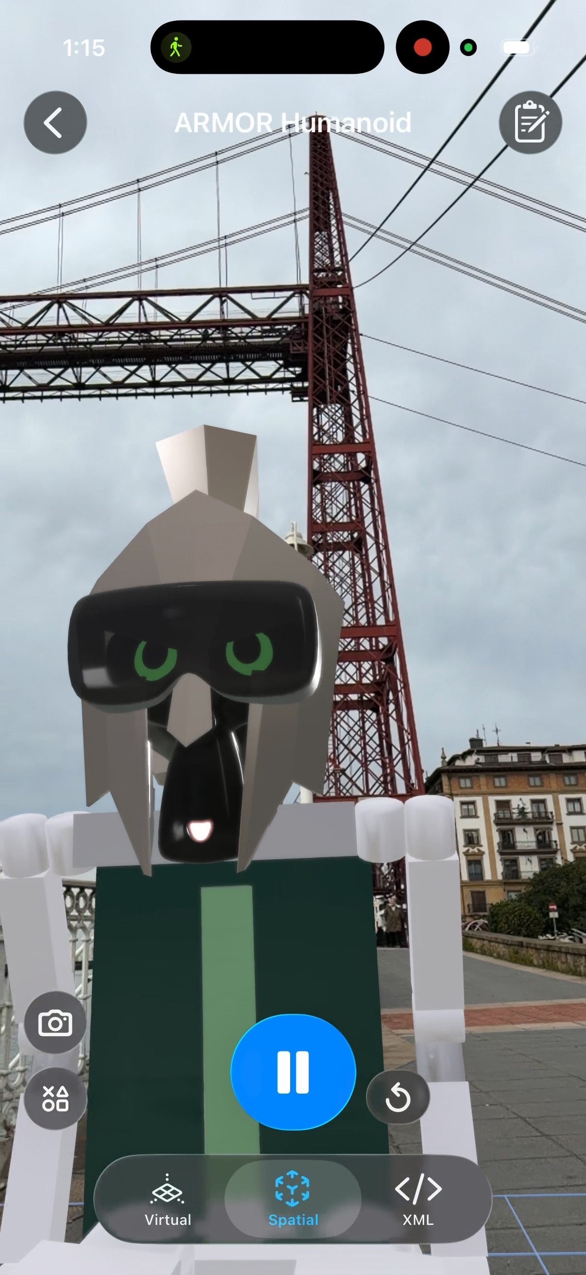 Custom humanoid robot mascot visualized in augmented reality outdoors using ARMOR AR robotics app on iPhone