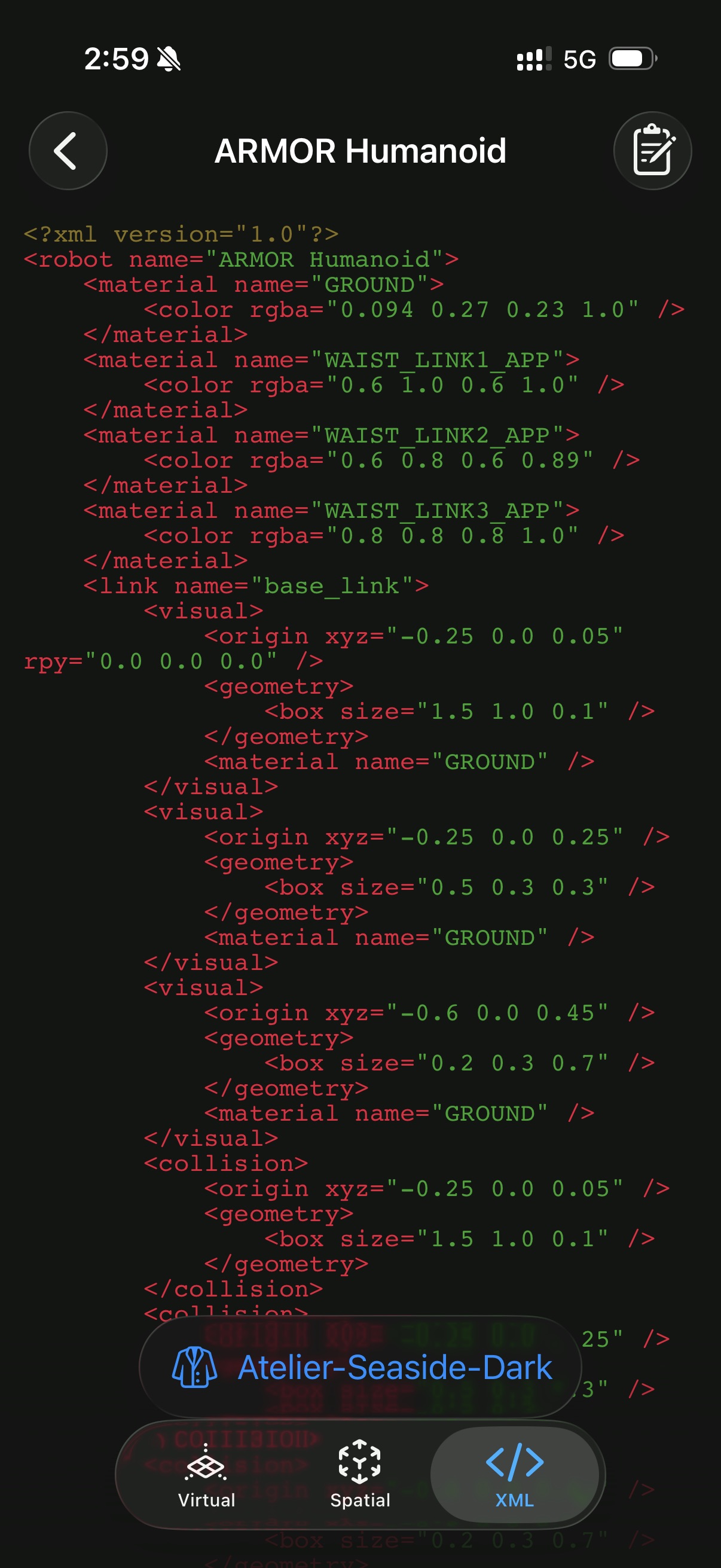 Native URDF XML code editor with syntax highlighting for robot description format files