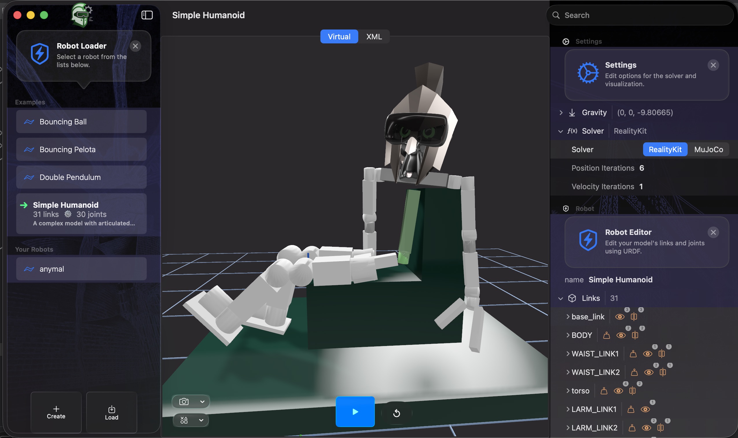 ARMOR robotics simulation app running on macOS showing 3D humanoid model and MuJoCo solver settings