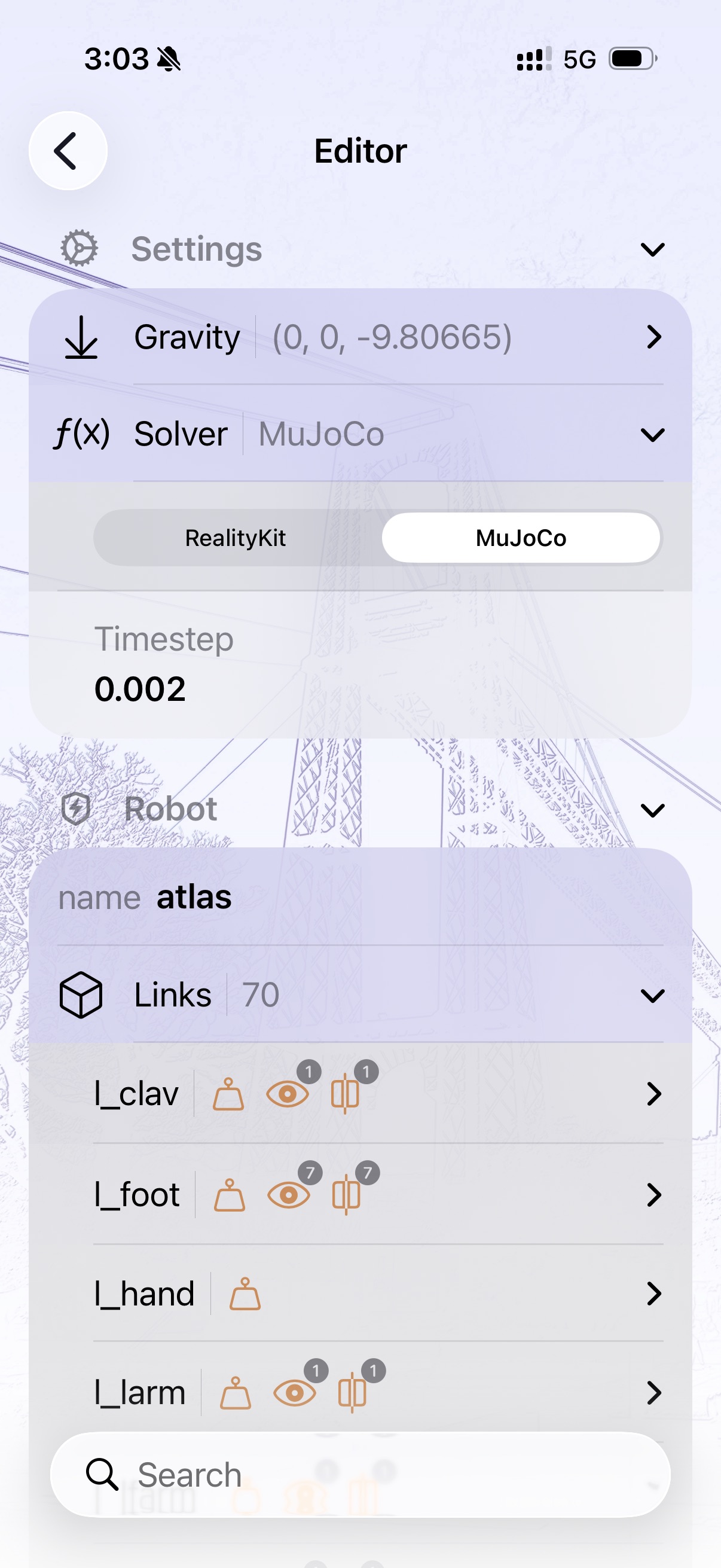 Mobile URDF editor interface for modifying robot links, joints, and MuJoCo physics parameters