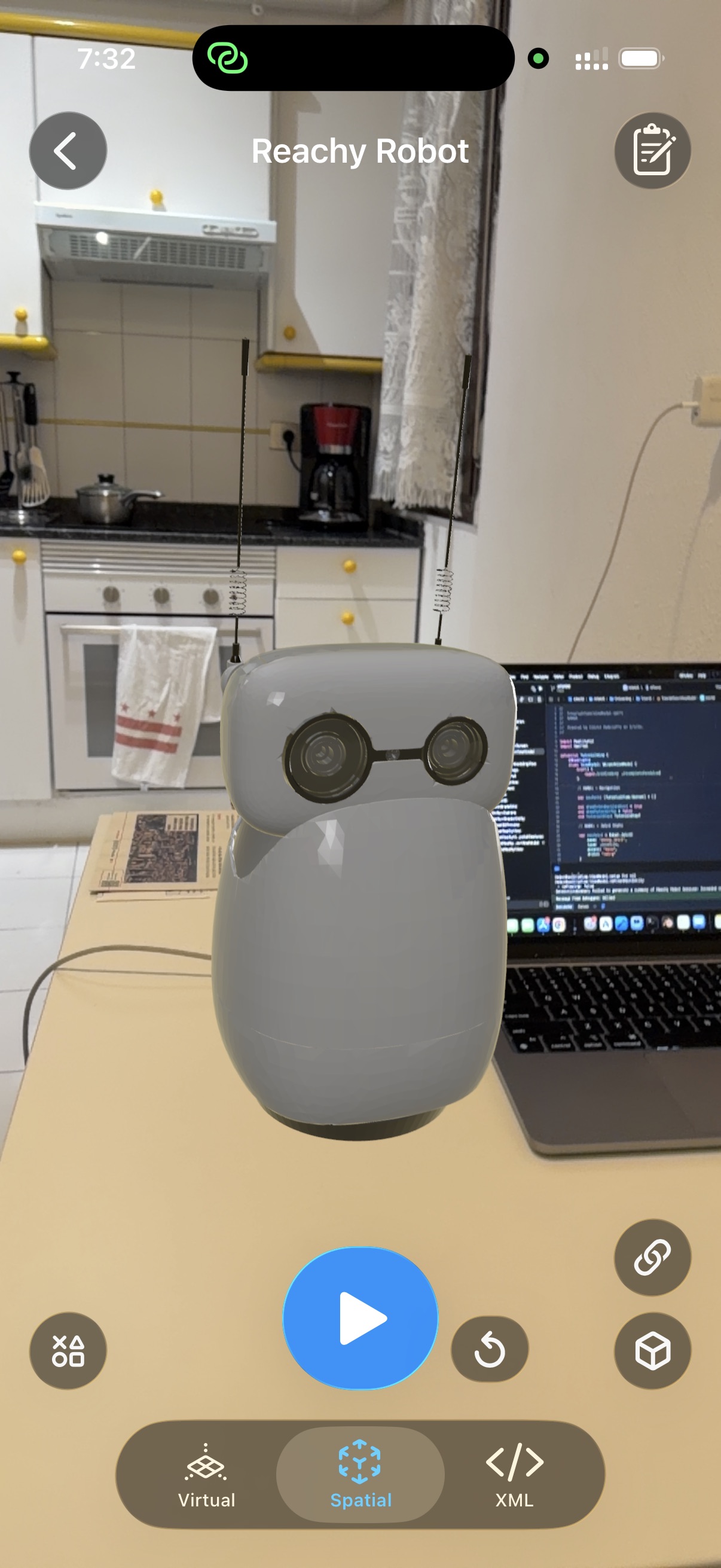 Reachy Mini AI companion robot by Hugging Face loaded in ARMOR URDF viewer with MuJoCo physics simulation on iPhone